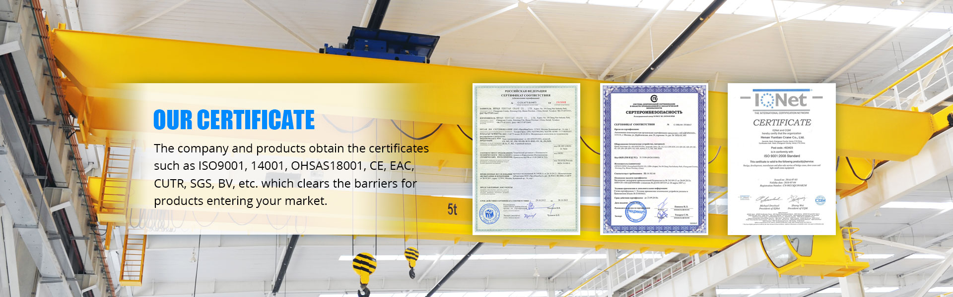 GB / T 19001-2000 idt ISO 9001:2000、GB / T 24001-2004 idt ISO 14001:2004、GB / T 28001-2001、OHSAS 18001:2000に準拠したあらゆる種類の産業クレーンを供給することができます。 1999年、CE、GOST、SGS、TUV、BVなど。